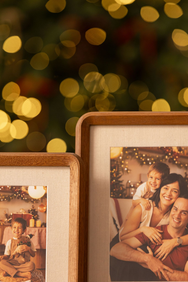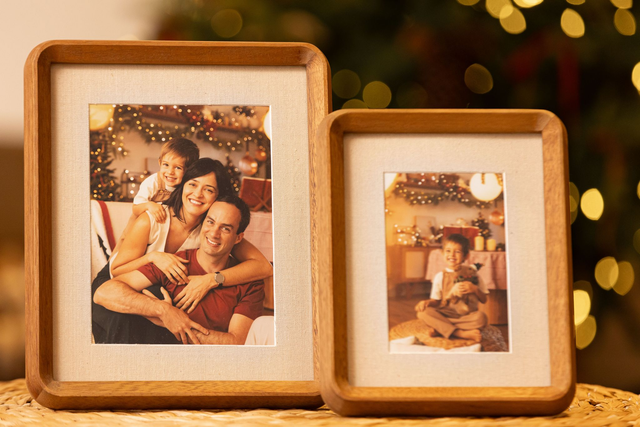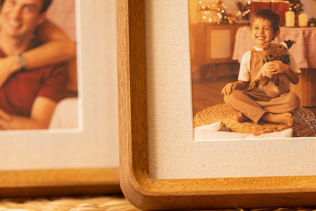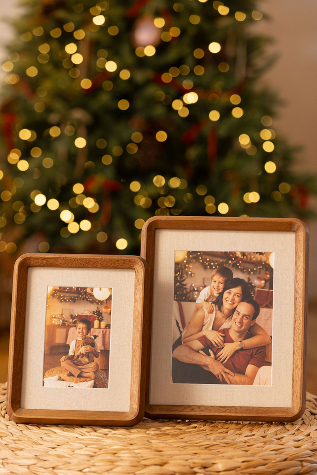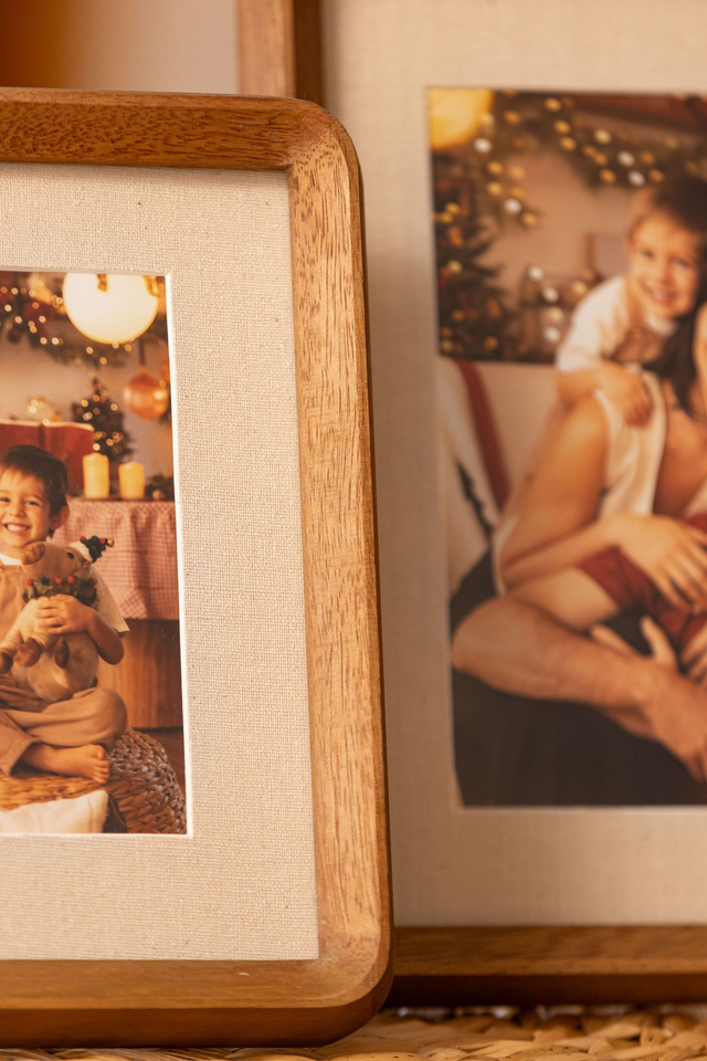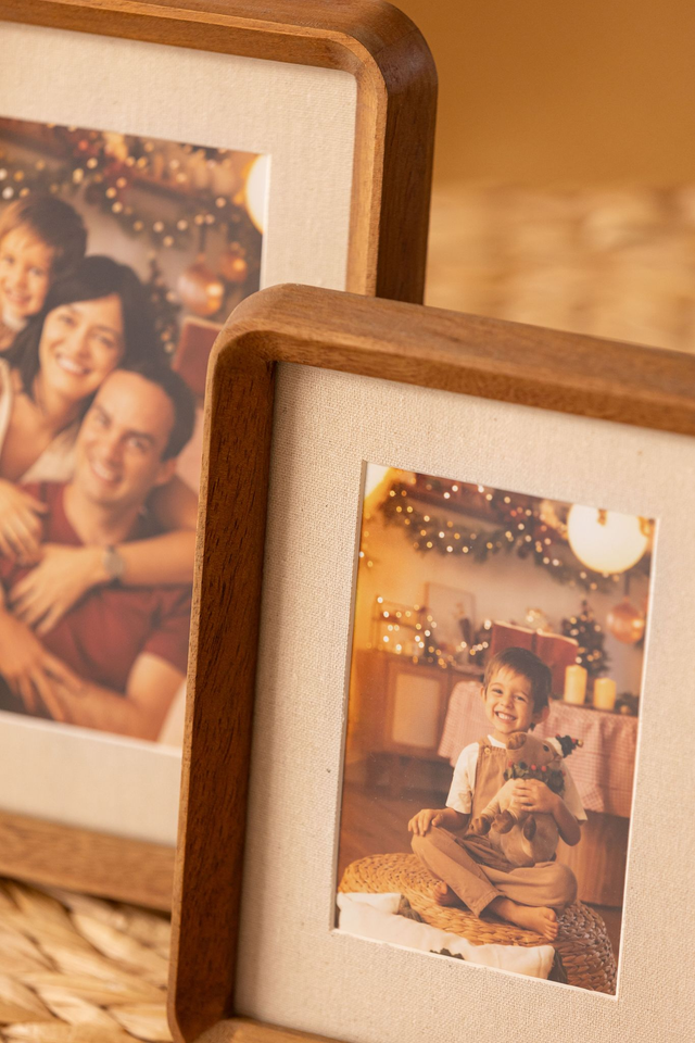 Moldura com veios visíveis e um acabamento que ressalta a beleza natural da madeira, paspatur interno com acabamento em linho. Este porta-retrato